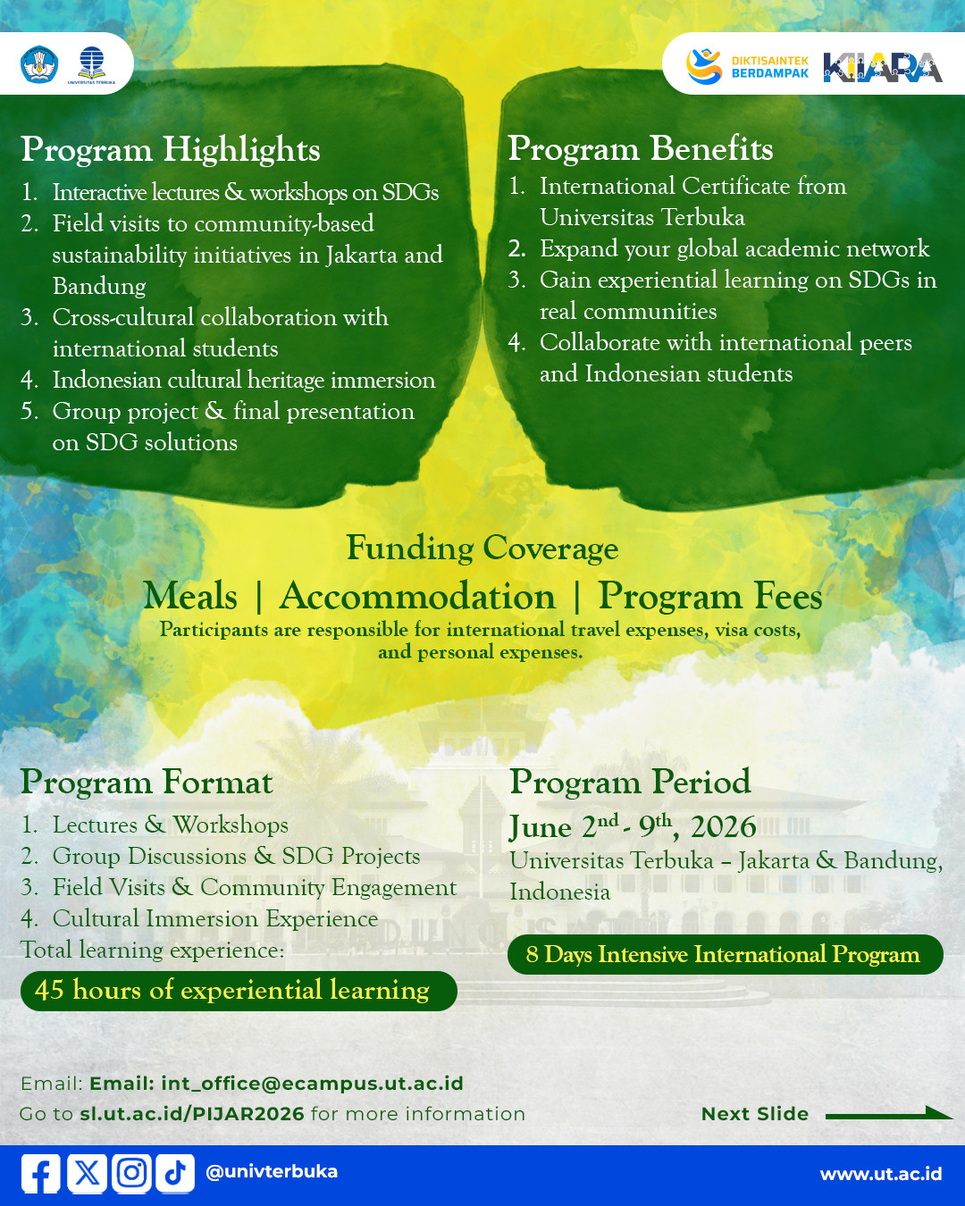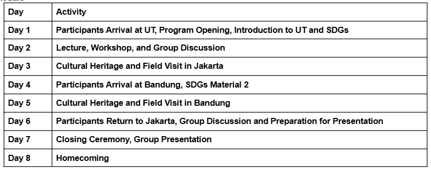 Through lectures, workshops, field visits, and group projects, participants will gain practical insights into the implementation of the Sustainable Development Goals (SDGs) within Indonesia’s diverse social, cultural, and academic contexts.